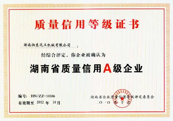 企業(yè)質(zhì)量信用等級(jí)分為A、B、C、D四等,分別代表守信、基本守信、失信和嚴(yán)重失信。湘東化機(jī)被評(píng)定為質(zhì)量信用A級(jí)企業(yè),代表著公司在不斷發(fā)展的過程中嚴(yán)把質(zhì)量關(guān),嚴(yán)格地遵守國家的相關(guān)政策和規(guī)定,遵守信用,在客戶心中形成了良好的企業(yè)形象。