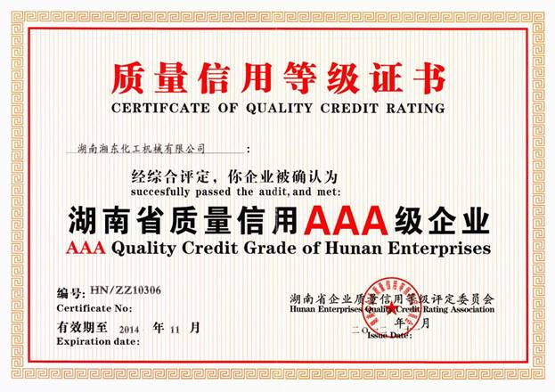 企業(yè)質(zhì)量信用等級評定活動由省質(zhì)量技術(shù)監(jiān)督局、省社會信用體系建設(shè)領(lǐng)導(dǎo)小組辦公室及省信用建設(shè)促進會聯(lián)合開展。2012年9月,湘東化機向省企業(yè)質(zhì)量信用等評辦提交“省質(zhì)量信用AAA級企業(yè)”申報材料并順利通過了文件初評,10月30日,省企業(yè)質(zhì)量信用等評辦評審專家組對湘東化機進行了現(xiàn)場評定,評審組在根據(jù)公司的經(jīng)營狀況、標準化管理和企業(yè)標準體系建設(shè)情況、計量管理和計量檢測體系建設(shè)情況、企業(yè)售后服務(wù)體系建設(shè)及消費者意見反饋情況、合同履行情況、完稅情況、產(chǎn)品質(zhì)量情況(如產(chǎn)品監(jiān)督抽查結(jié)果、各種質(zhì)量認證情況、采標情況等)及近3年內(nèi)企業(yè)規(guī)范經(jīng)營及獎懲情況,依據(jù)“公正、客觀、科學(xué)”原則,在對公司和產(chǎn)品進行全面了解、考察調(diào)研和分析的基礎(chǔ)上,對公司質(zhì)量信用行為的可靠性、安全性程度作出綜合評價,最終經(jīng)評審組討論認定,湘東化機符合質(zhì)量信用最高等級——AAA級企業(yè)評定要求,順利通過評定。