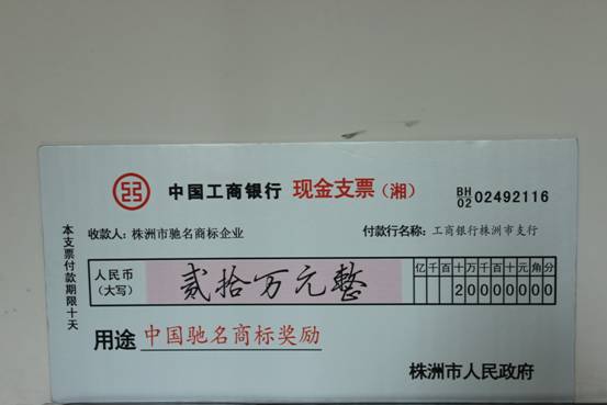 2013年9月6日,我公司參加了株洲市馳名商標(biāo)表彰大會(huì),我公司因2012年獲“中國(guó)馳名商標(biāo)”受到通報(bào)表彰。(《株洲市人民政府辦公室關(guān)于表彰我市被新認(rèn)定為2011-2012年中國(guó)馳名商標(biāo)、湖南省著名商標(biāo)企業(yè)的通報(bào)》株政辦函[2013]85號(hào)),會(huì)上,我公司捧回“中國(guó)馳名商標(biāo)”牌,并受到株洲市人民政府給予表彰企業(yè)的20萬(wàn)元獎(jiǎng)勵(lì)金。