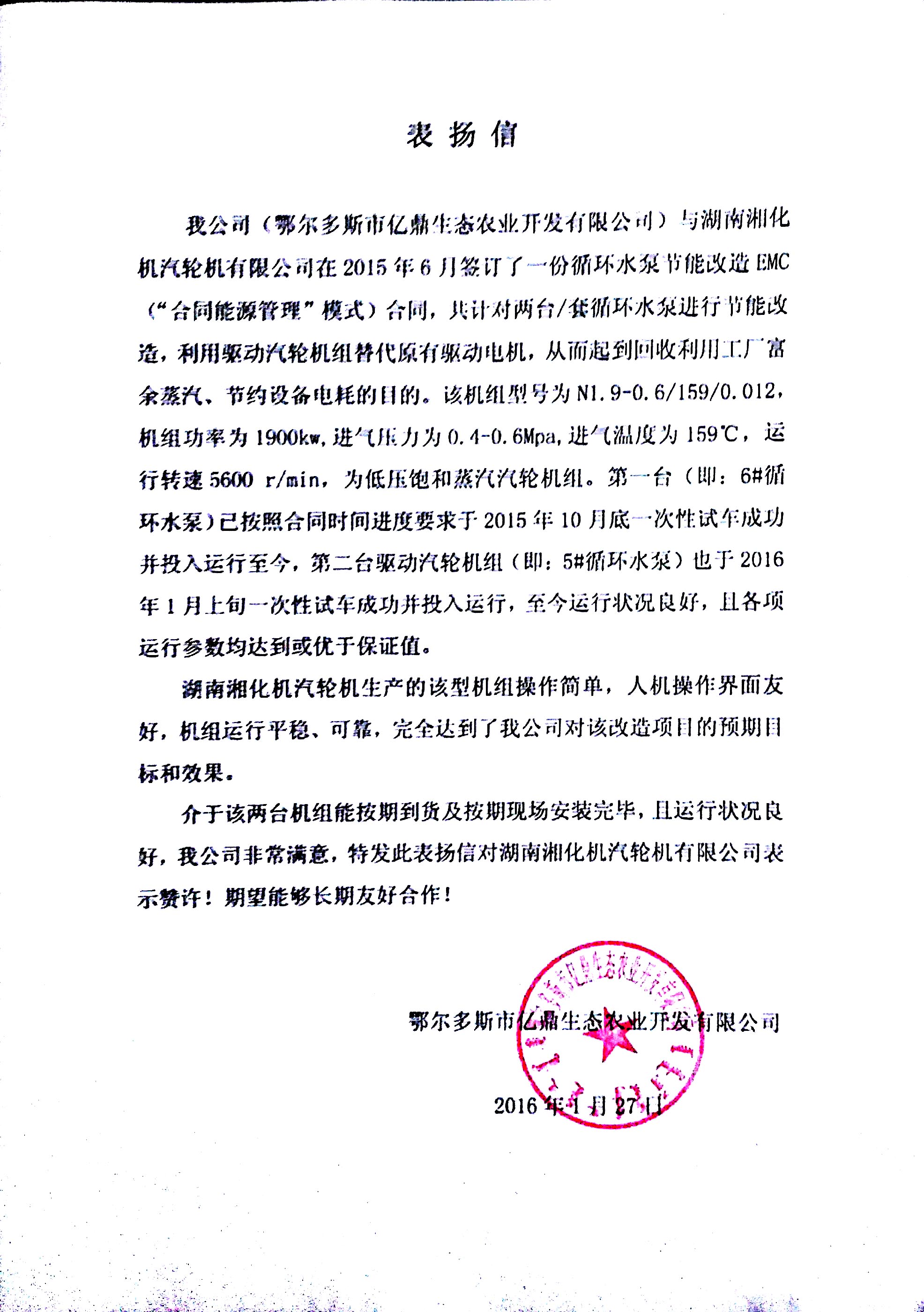 2016年1月27日,湘化機汽輪機公司收到鄂爾多斯億鼎生態(tài)農(nóng)業(yè)開發(fā)有限公司的表揚信,表揚汽輪機公司在2015年對億鼎生態(tài)農(nóng)業(yè)開發(fā)有限公司兩臺循環(huán)水泵的節(jié)能改造工作高度滿意,汽輪機公司利用驅(qū)動汽輪機組替代原有驅(qū)動電機,該機組操作簡單,人機操作界面友好,機組運行平衡,投入運行后狀況良好,完全達到了回收利用工廠富余蒸汽、節(jié)約設備電耗的預期目標和效果,并期望與我公司長期友好合作!