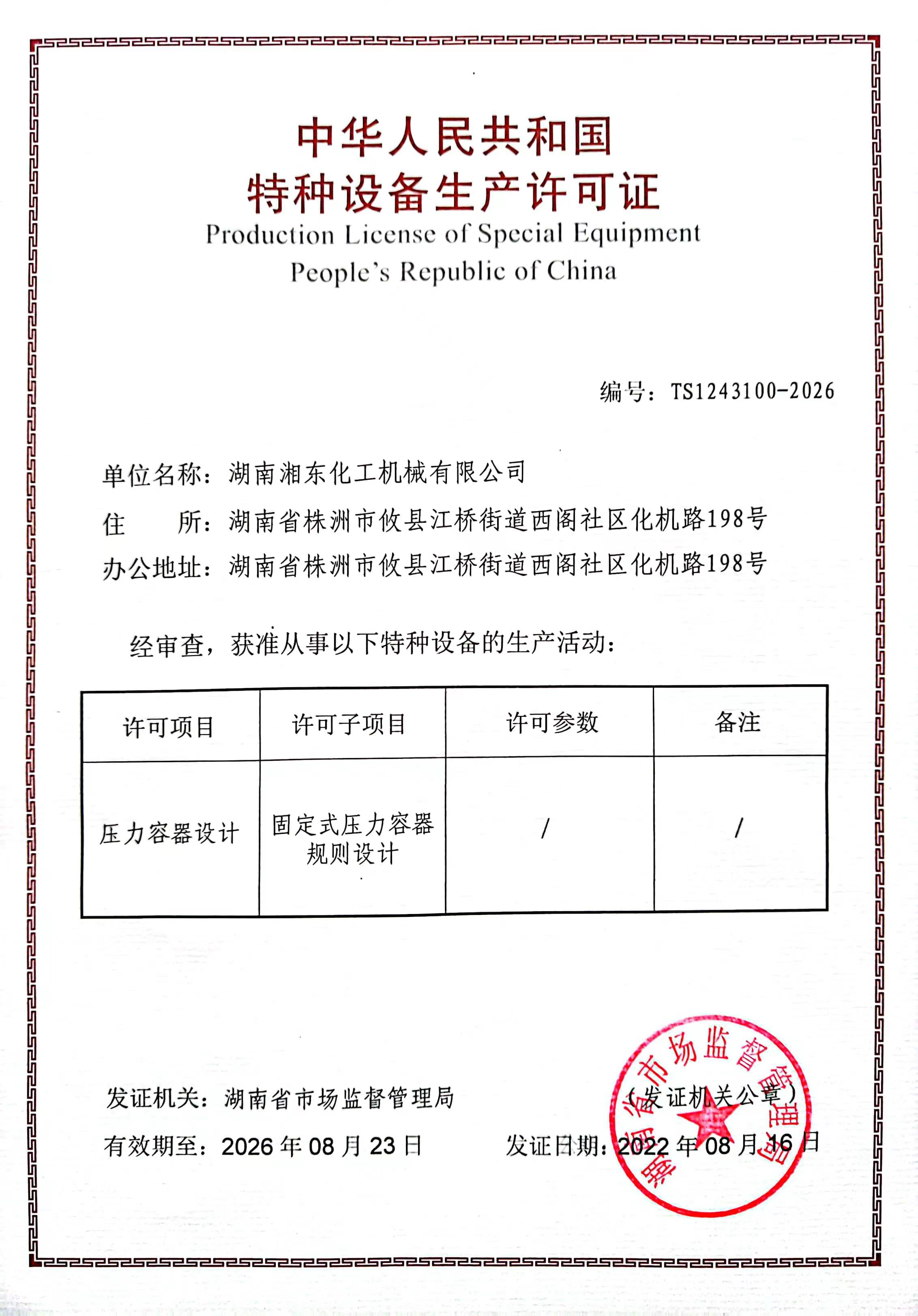 特種設(shè)備生產(chǎn)許可證(A1)